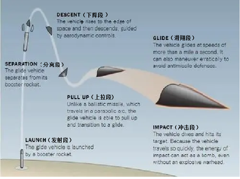 (滑翔段)滑翔速度大于1哩(英里)/秒,并以飄忽不定(erratically)的機(jī)動方式飛行,以躲避反導(dǎo)雷達(dá)的追蹤